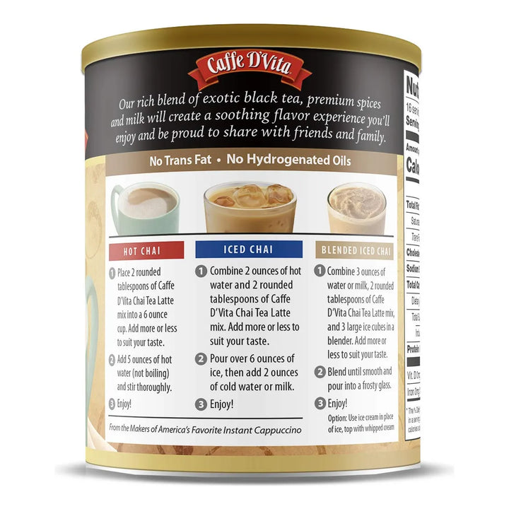 ¿Cansado de gastar dinero en cafés caros o de perder tiempo preparando bebidas complicadas? Nuestra mezcla en polvo te permite disfrutar de un chai latte perfecto en minutos, adaptándolo a tu gusto: caliente, frío o incluso mezclado con tus recetas favoritas. Las instrucciones están justo en el envase para que cada sorbo sea perfecto.