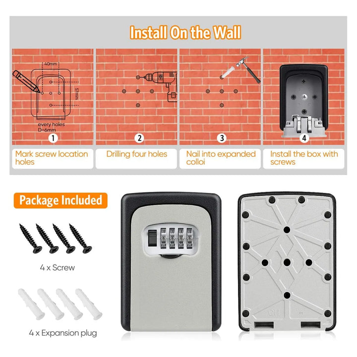 La caja se activa girando las ruedas numéricas hasta alinear tu código personal. Al abrirla, un mecanismo de resorte suave permite un acceso rápido sin complicaciones. Para instalarla: 1) Elige un lugar visible pero discreto en tu pared exterior. 2) Perfora guiándote por los agujeros de la plantilla incluida. 3) Atornilla firmemente usando los accesorios proporcionados. 4) ¡Configura tu código secreto y listo!