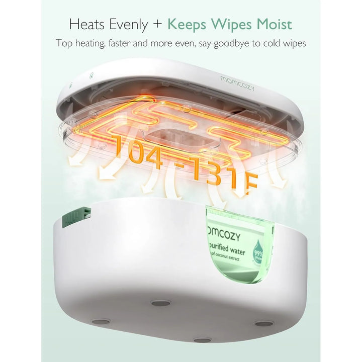 El calentador de toallitas Momcozy utiliza un sistema de calor superior que mantiene las toallitas en la temperatura ideal desde la primera hasta la última. Su diseño con resorte integrado asegura que el calor se distribuya uniformemente, mientras que el sello de silicona evita que pierdan humedad. Simplemente coloca el paquete de toallitas dentro, selecciona la temperatura deseada y disfruta de la comodidad en cada uso.