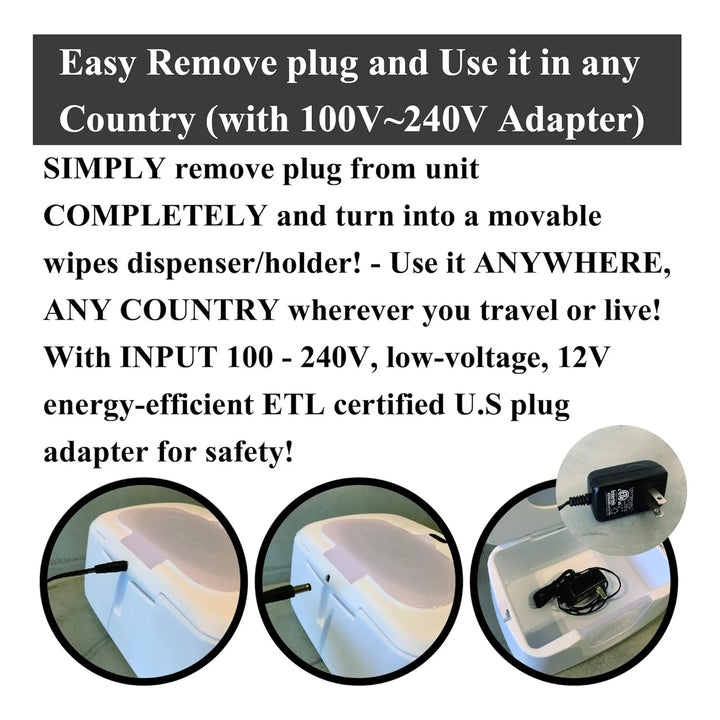 La seguridad de tu bebé es lo primero. Por eso este calentador funciona con bajo voltaje (12V) y cuenta con certificación ETL, garantizando protección contra sobrecalentamiento. Su enchufe americano de 100-240V lo hace compatible para uso internacional (adaptador no incluido), perfecto para familias viajeras.