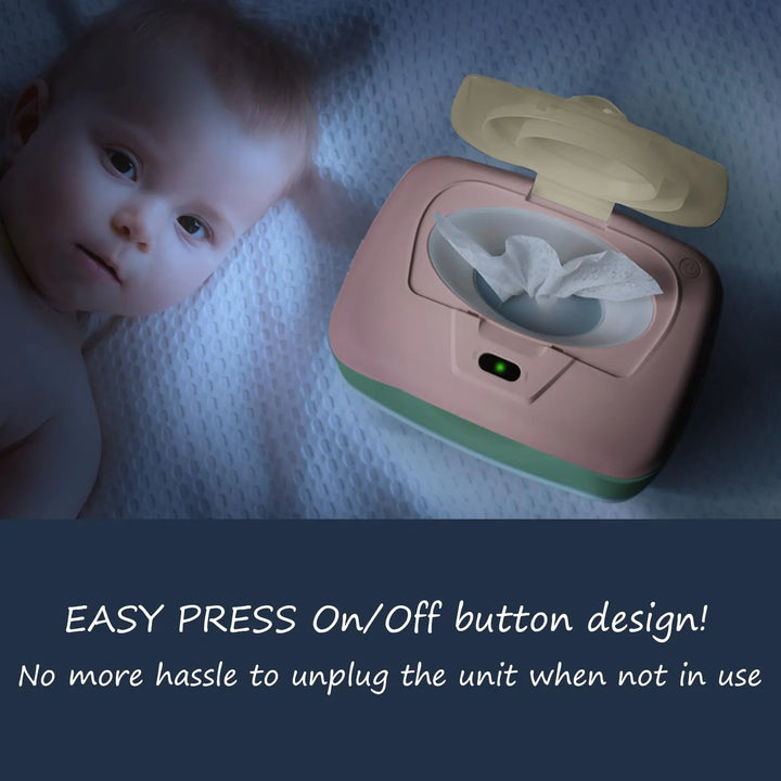 El calentador utiliza un sistema de baja potencia para calentar las toallitas de manera uniforme, manteniéndolas a una temperatura ideal sin riesgo de sobrecalentamiento. Su tapa hermética asegura que el calor y la humedad se conserven, mientras que el botón de encendido/apagado te da control total en todo momento.