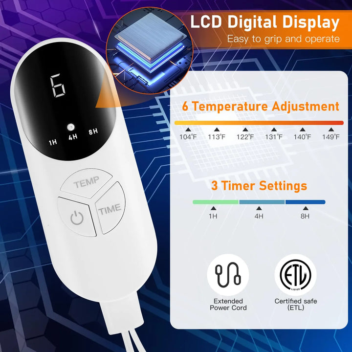 Con 6 niveles de calefacción que van desde los 104°F hasta los 149°F, puedes personalizar el calor según tu preferencia. Además, la función de temporizador de 1 a 8 horas te permite programar el apagado automático, ahorrando energía y evitando riesgos. ¡Dile adiós a los pies fríos y hola al confort inteligente!