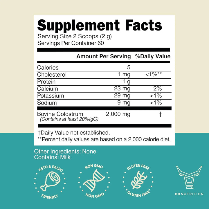 Imagina un suplemento que no solo fortalece tu sistema inmunológico, sino que también cuida de tu intestino, ayuda a la recuperación muscular y mejora tu belleza desde adentro. El calostro en polvo OXNUTRITION es ese aliado que tu cuerpo necesita para alcanzar su máximo potencial. Proveniente de la primera leche de vacas alimentadas con pasto en Estados Unidos, este superalimento orgánico está repleto de inmunoglobulinas, factores de crecimiento y aminoácidos esenciales.