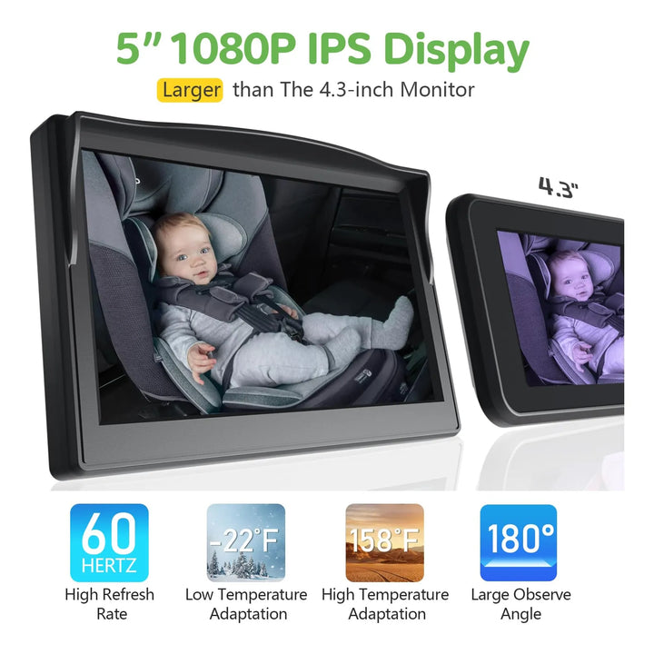 Con su pantalla IPS de 5 pulgadas y resolución Full HD, cada detalle se muestra con colores vibrantes y nitidez impecable. La tecnología de visión nocturna por infrarrojos garantiza que, incluso en la oscuridad, puedas ver a tus hijos como si fuera de día. No más luces rojas molestas ni imágenes borrosas. Solo tranquilidad y seguridad en cada kilómetro.