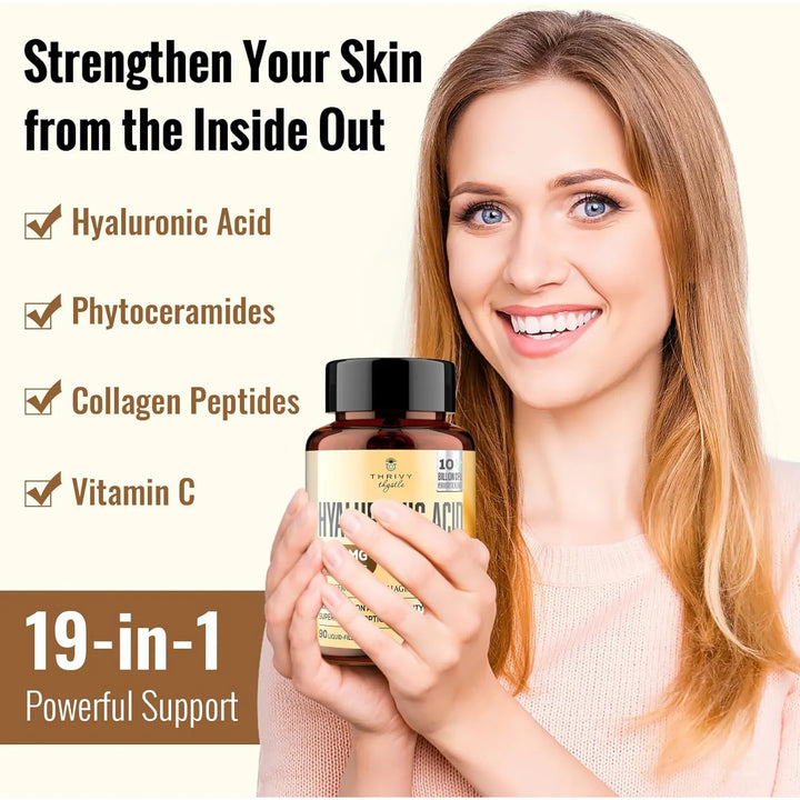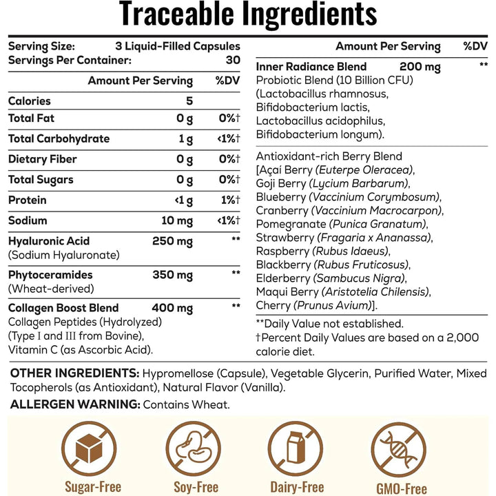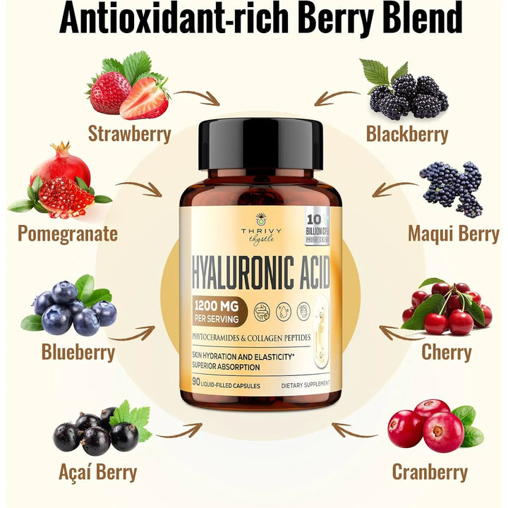 - Fórmula 19 en 1: Combina los beneficios del ácido hialurónico, colágeno, vitamina C, fitoceramidas, probióticos y extractos de bayas en una sola cápsula. 🌈