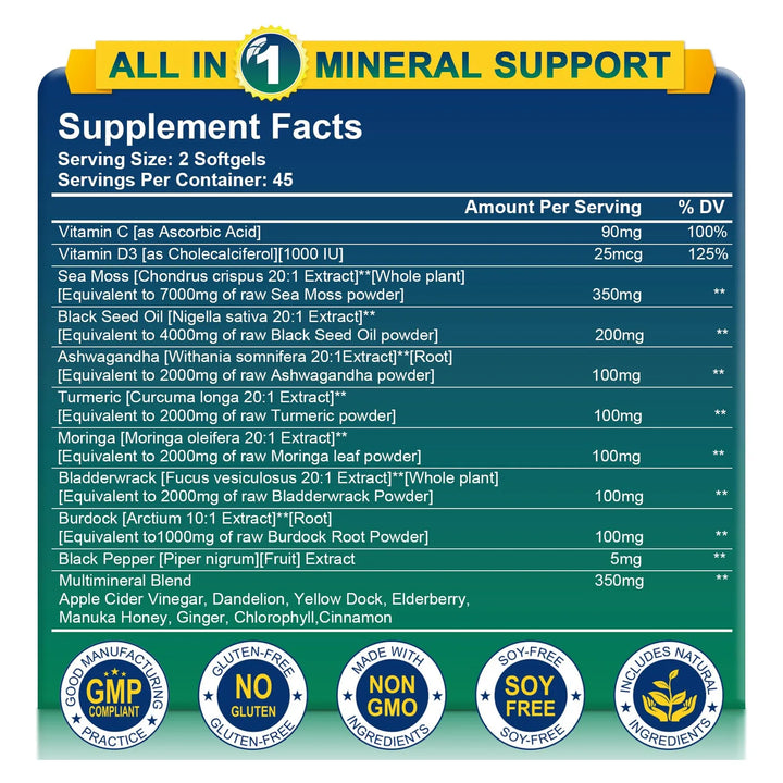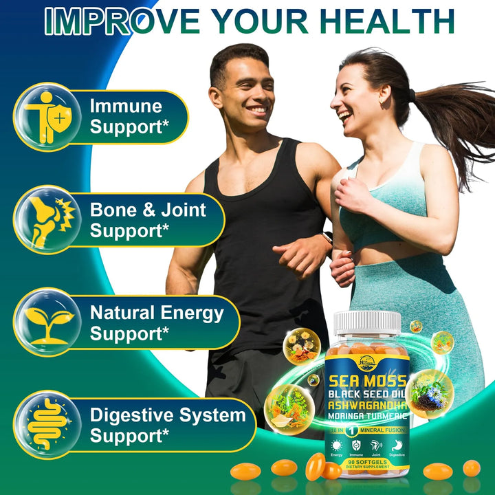 Imagina despertar cada mañana con una energía renovada, sintiendo cómo tu piel recupera su brillo natural y tus articulaciones se mueven con mayor facilidad. Este producto no es solo un suplemento, es un aliado para tu salud. El musgo marino, combinado con aceite de semilla negra, ashwagandha y otros poderosos ingredientes, trabaja en sinergia para ofrecerte beneficios que notarás en poco tiempo.