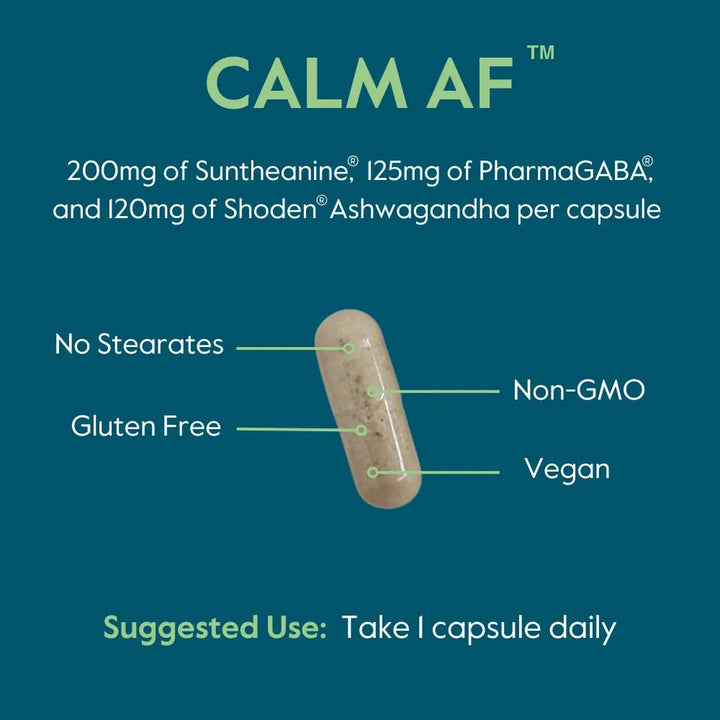 La fórmula avanzada de Calm AF actúa en sinergia para apoyar tu sistema nervioso. Shoden Ashwagandha reduce los niveles de cortisol, la hormona del estrés, mientras que Suntheanine promueve la relajación sin somnolencia. PharmaGABA, por su parte, es un neurotransmisor que calma la actividad cerebral excesiva. Juntos, crean un efecto calmante profundo y duradero.