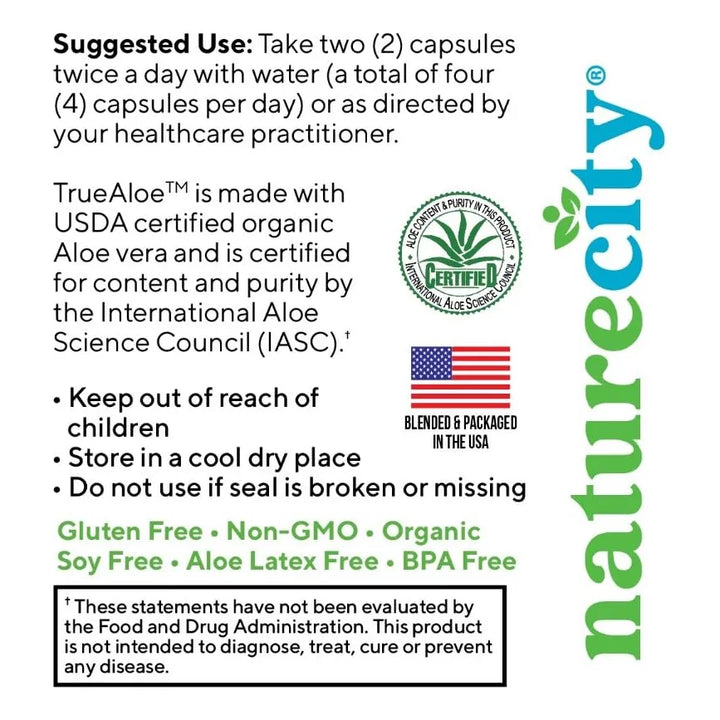 El aloe vera es conocido por sus increíbles beneficios, pero no todos los productos son iguales. True-Aloe utiliza solo aloe vera orgánico, sin rellenos ni aditivos, certificado por el Consejo Internacional de Ciencias del Aloe (IASC). Cada cápsula está repleta de nutrientes esenciales que tu cuerpo necesita para funcionar al máximo.