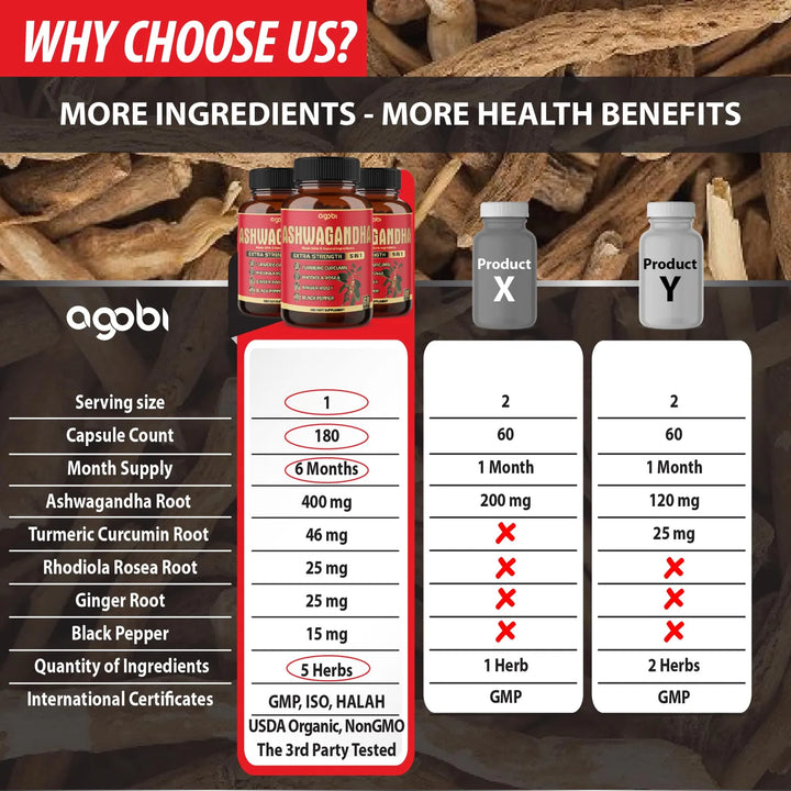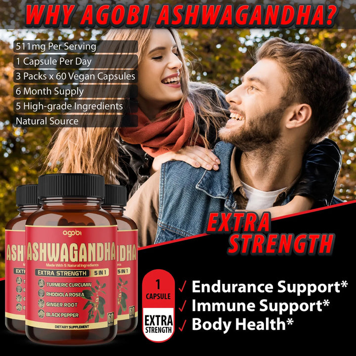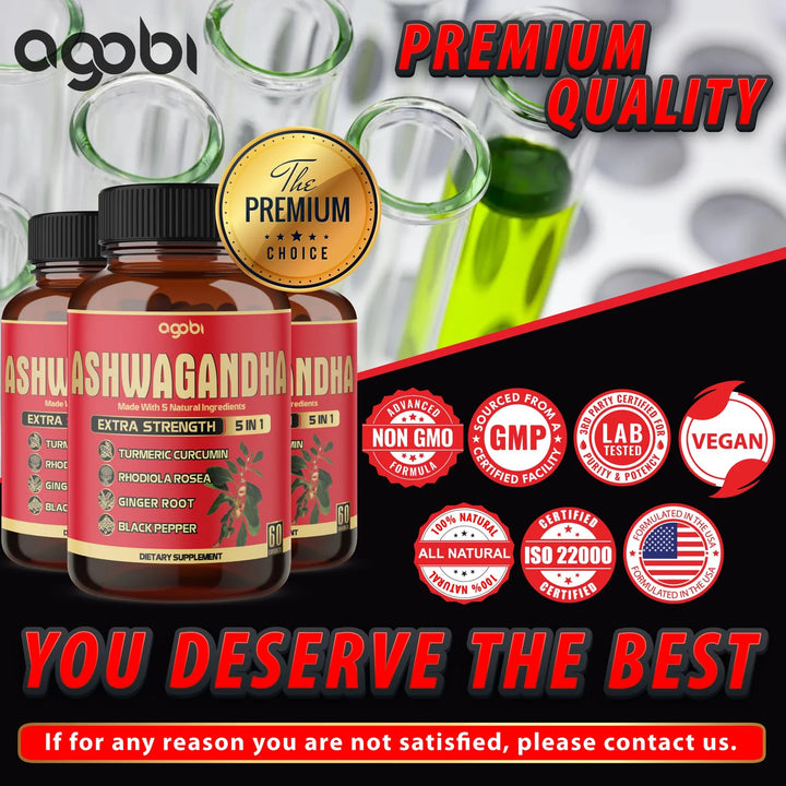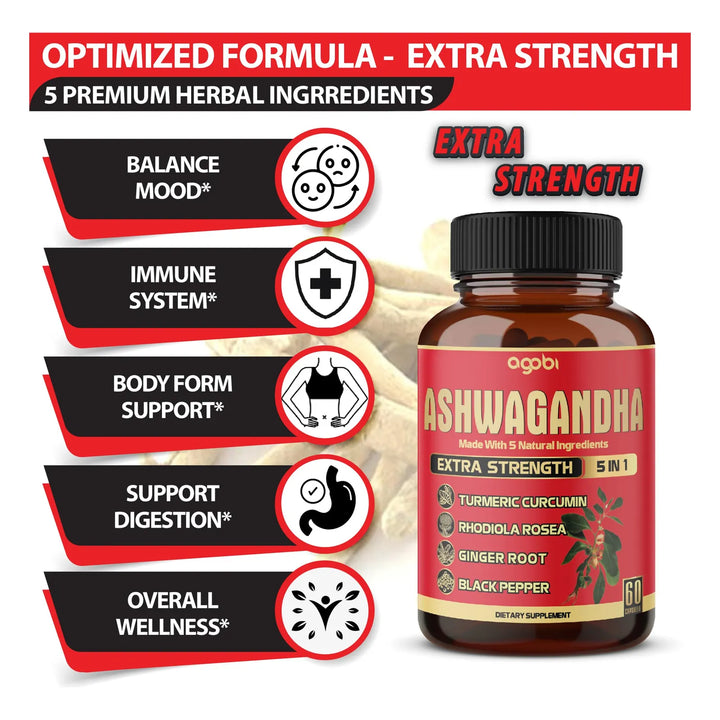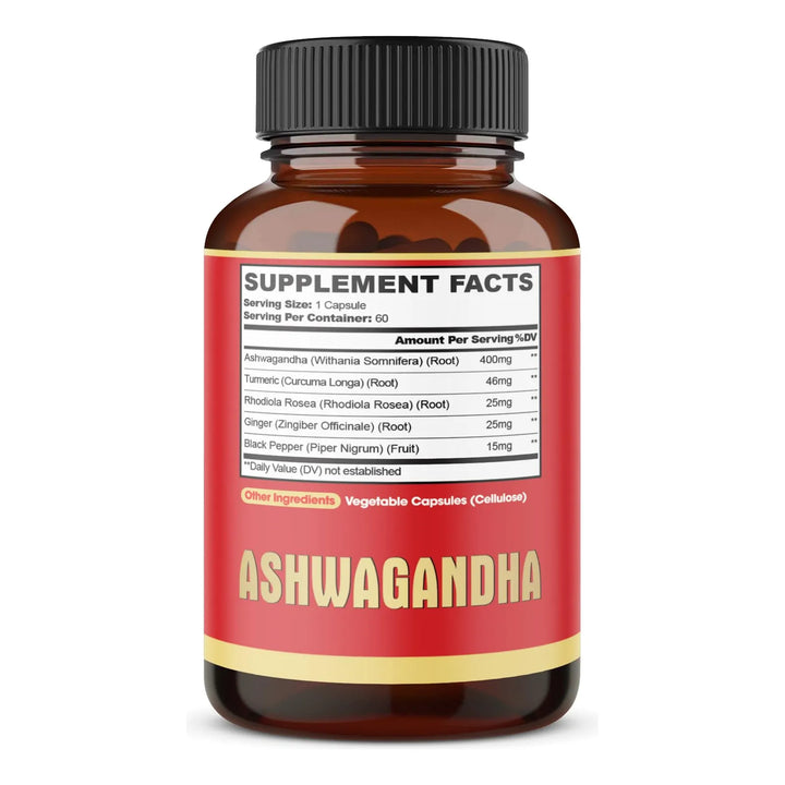 - Fórmula 5 en 1: Ashwagandha, jengibre, cúrcuma, Rhodiola Rosea y pimienta negra en una sola cápsula. 🌟