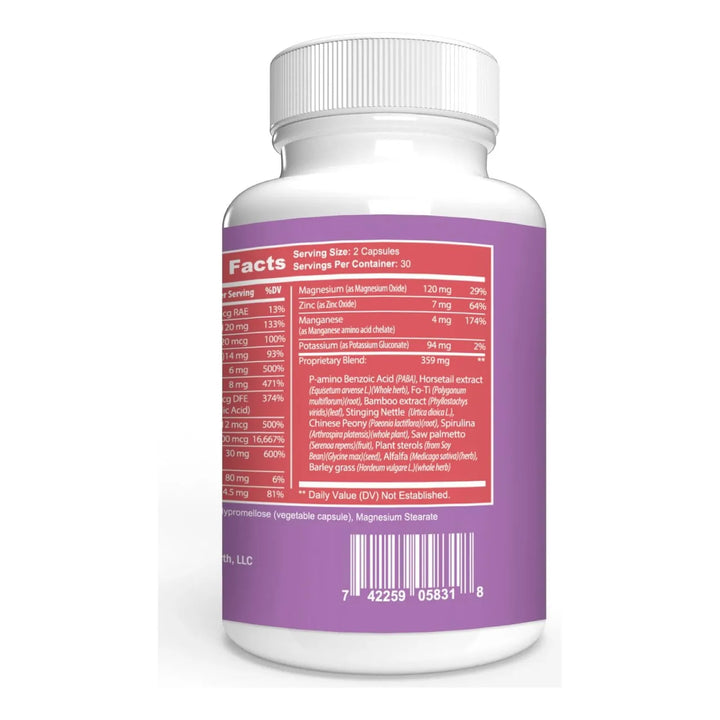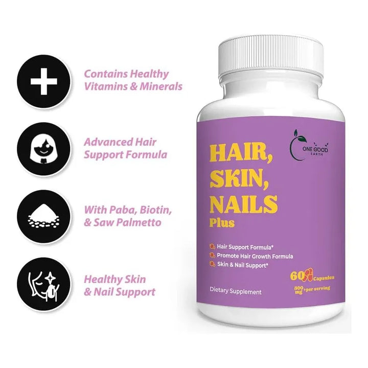 La biotina (vitamina B7) activa la producción de queratina, la proteína esencial para el cabello y uñas, mientras que las vitaminas A, C, D y E reparan tejidos y combaten el estrés oxidativo. El saw palmetto regula hormonas relacionadas con la caída del cabello, creando un efecto sinérgico.