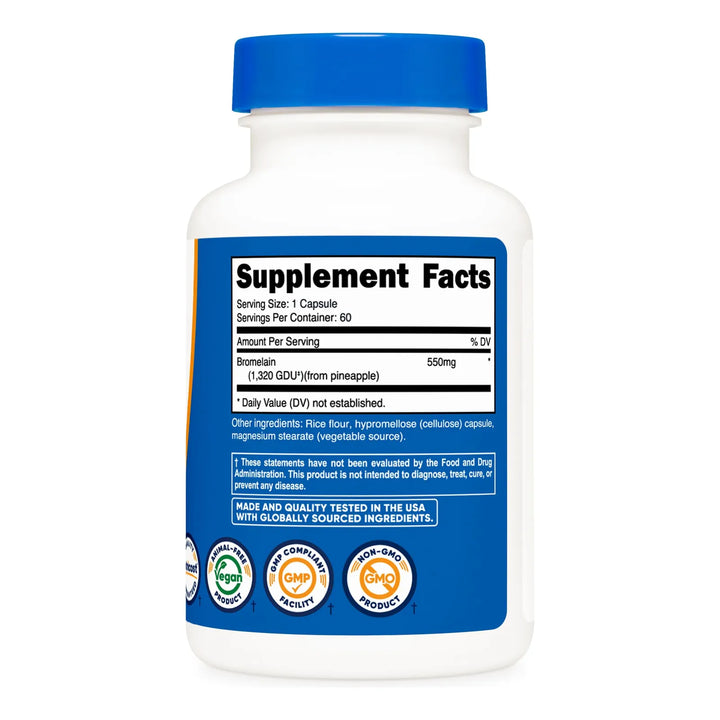La vida moderna puede ser agotadora, llena de estrés y desafíos para nuestro cuerpo. Por eso, necesitamos soluciones que nos ayuden a mantenernos fuertes y vitales. Nuestras cápsulas de Bromelina no solo son potentes (550 mg por porción), sino que también están fabricadas bajo los más altos estándares de calidad en instalaciones certificadas por GMP. Esto significa que cada cápsula que tomas está respaldada por rigurosas pruebas de terceros, garantizando su pureza y eficacia. ¿No mereces lo mejor para tu salud?