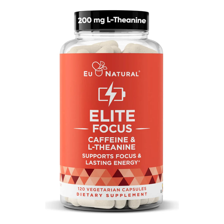Elite Cafeína con L-teanina, fuerza extra sin temblores, energía enfocada, cápsulas nootrópica natural para el rendimiento cognitivo, 120 cápsulas suaves.