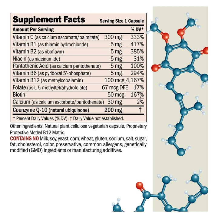 La Coenzima Q10 es un componente natural que tu cuerpo utiliza para producir energía a nivel celular. Con el tiempo, sus niveles disminuyen, afectando tu vitalidad. Nuestras cápsulas reponen este nutriente crítico, apoyando la producción de ATP (la molécula de energía) y protegiendo tus células del daño oxidativo. Además, las vitaminas B y C en la fórmula mejoran la absorción y potencian sus efectos, dándote un impulso integral.