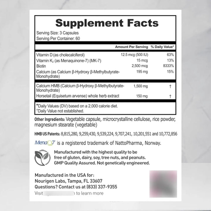 Nuestra fórmula patentada actúa en tres fases clave: estimulación, regeneración y protección. El HMB y las vitaminas activan tu producción natural de colágeno, mientras los péptidos reconstruyen las estructuras celulares de tu piel. La cola de caballo y biotina sellan la humedad, creando una barrera protectora duradera.