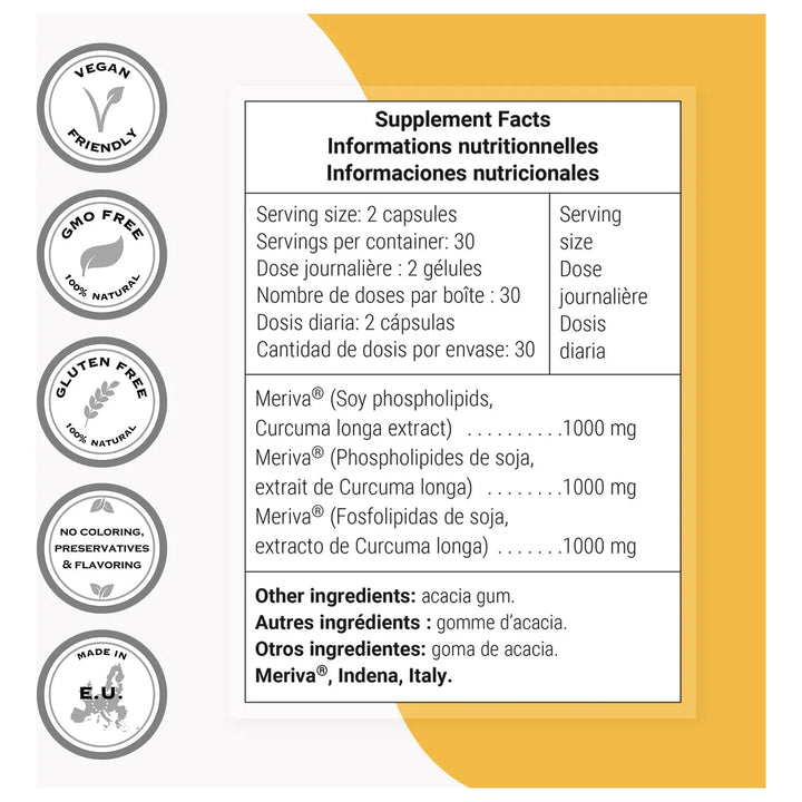 La curcumina, el componente activo de la cúrcuma, es conocida por sus propiedades antiinflamatorias y antioxidantes. Sin embargo, su baja biodisponibilidad ha sido siempre un desafío. Meriva resuelve este problema al encapsular la curcumina en fosfolípidos de soja, creando fitosomas que mejoran significativamente su absorción. Esto significa que cada cápsula que tomas trabaja más eficientemente en tu cuerpo.