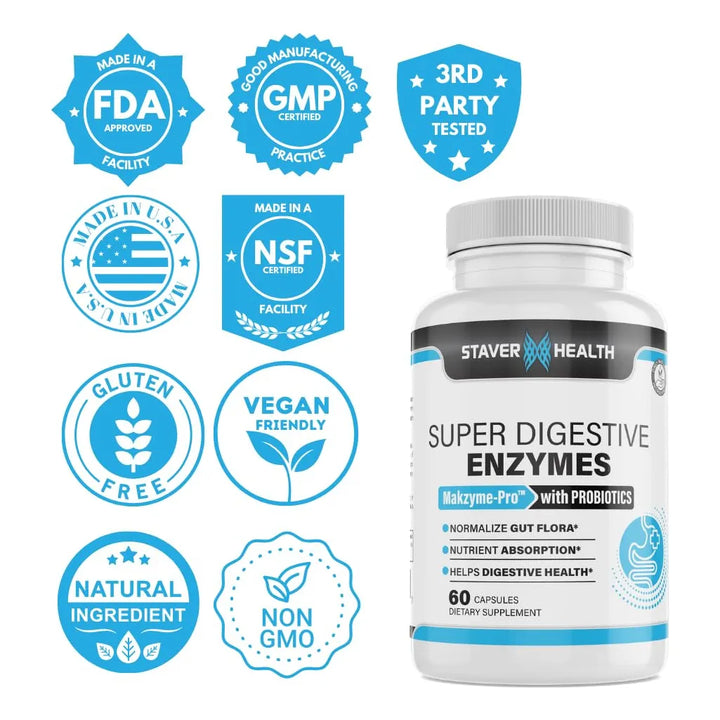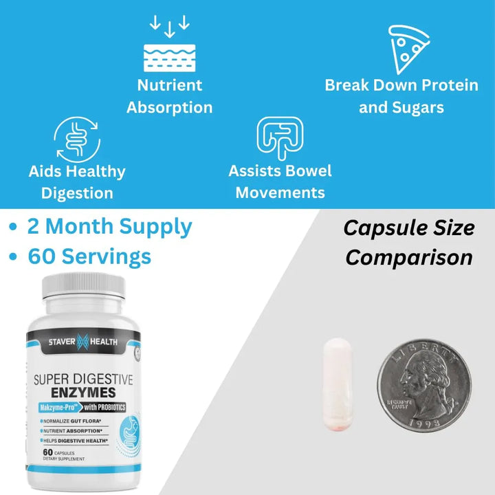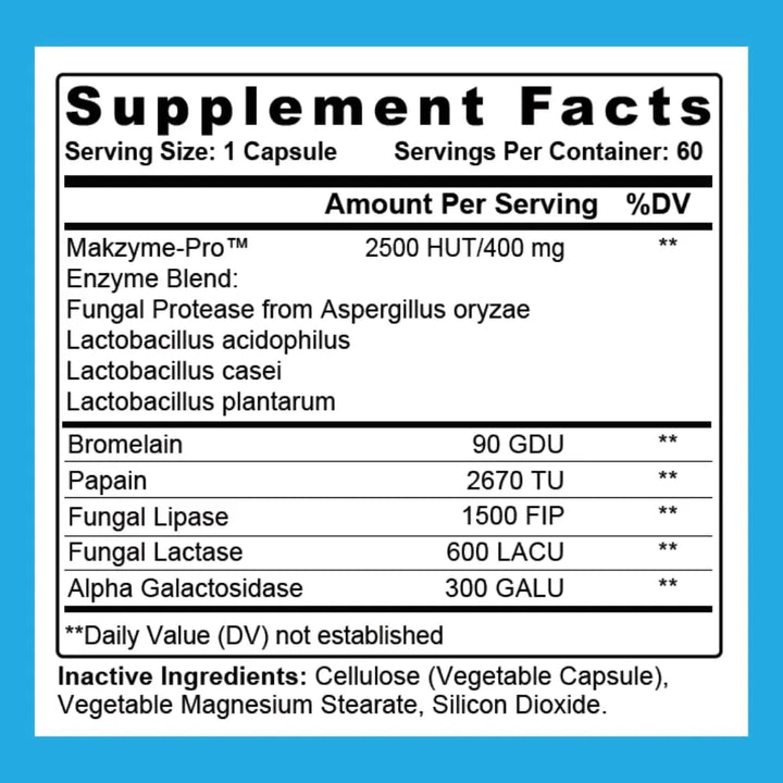 Nuestro suplemento no solo mejora tu digestión, sino que también apoya la salud intestinal gracias a su mezcla única de enzimas y probióticos. Cada cápsula está formulada con ingredientes cuidadosamente seleccionados para garantizar el máximo beneficio. Con 60 porciones por botella, tendrás un suministro de dos meses que te acompañará en cada comida. ¿Listo para decir adiós a las molestias digestivas?