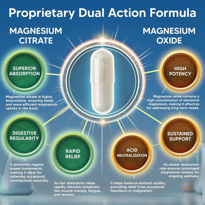 El citrato de magnesio se absorbe rápidamente en el torrente sanguíneo, aliviando síntomas como calambres o estrés en minutos. Mientras tanto, el óxido de magnesio libera sus beneficios gradualmente, manteniendo niveles óptimos durante todo el día. Juntos, trabajan sinérgicamente para: