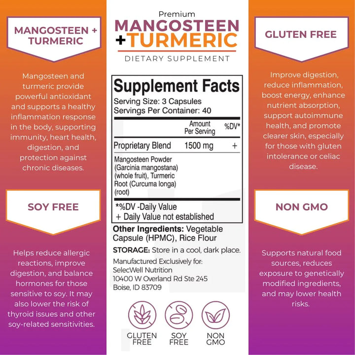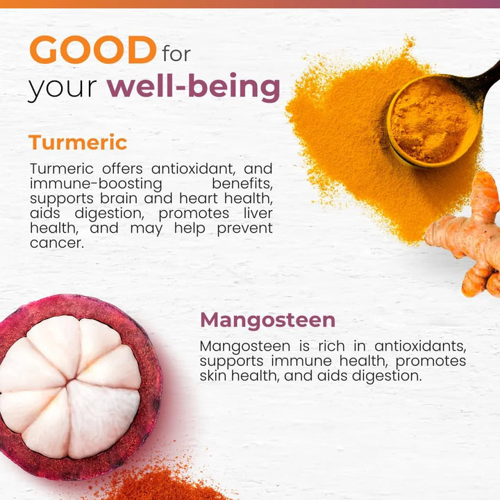 Las cápsulas de mangostán y cúrcuma actúan sinérgicamente para proporcionar beneficios integrales. El mangostán, rico en xantonas, combate los radicales libres y apoya la salud celular, mientras que la cúrcuma, con su curcumina, reduce la inflamación y promueve la salud articular. Juntos, estos ingredientes mejoran la digestión, fortalecen el sistema inmunológico y contribuyen a una piel más saludable.