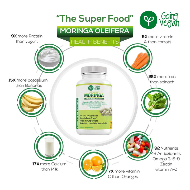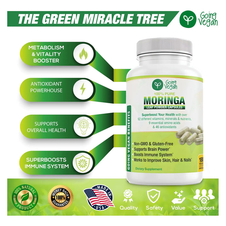 Imagina despertar cada mañana con una vitalidad renovada, sintiéndote más fuerte y protegido contra los desafíos diarios. La Moringa, conocida como el "árbol milagroso", está cargada con 92 vitaminas, minerales y nutrientes esenciales, incluyendo antioxidantes poderosos y aminoácidos que tu cuerpo no puede producir por sí solo. No es solo un suplemento, es un aliado para una vida más saludable y equilibrada.