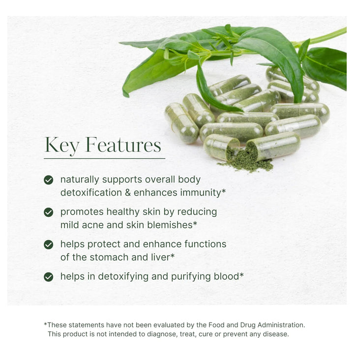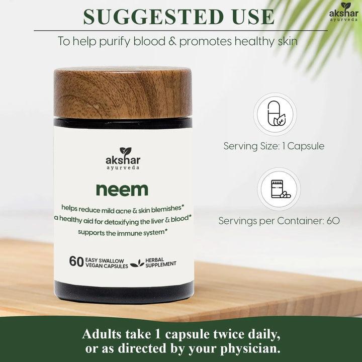 El neem, una hierba ayurvédica milenaria, es conocido por sus potentes propiedades desintoxicantes y purificadoras. Nuestras cápsulas combinan lo mejor de esta planta en una fórmula vegana y libre de crueldad, diseñada para apoyar tu salud de manera natural y efectiva.