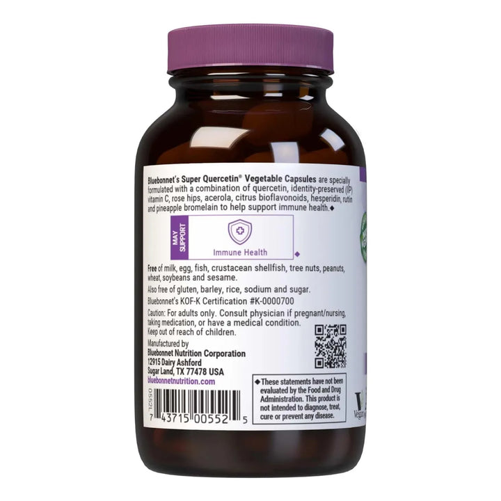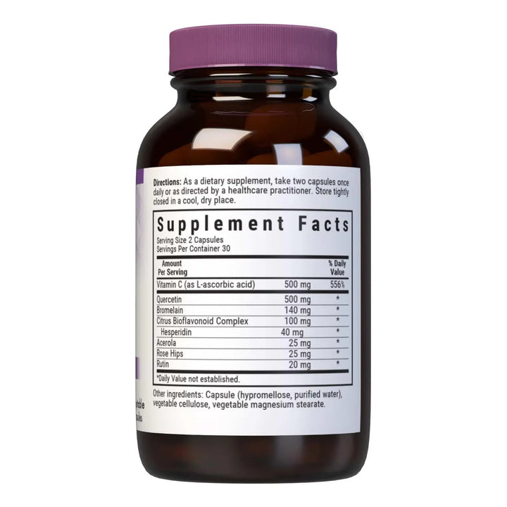La quercetina actúa como un poderoso antioxidante que ayuda a neutralizar los radicales libres, mientras que la vitamina C fortalece las defensas naturales del cuerpo. La combinación con bioflavonoides y bromelina mejora la absorción y eficacia, brindando un apoyo inmunológico completo.