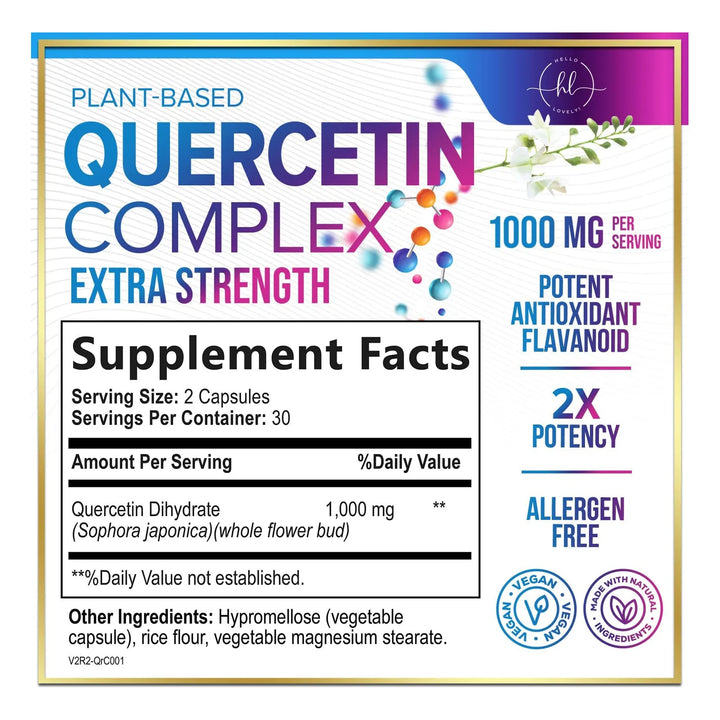 La quercetina es un flavonoide natural que actúa como un escudo para tu cuerpo. Con 500 mg por cápsula y 1000 mg por porción, este suplemento te brinda la dosis perfecta para combatir el estrés oxidativo y reducir la inflamación. ¿Sabías que el estrés oxidativo es uno de los principales culpables del envejecimiento prematuro y las enfermedades crónicas? Con nuestras cápsulas, estarás dando un paso crucial hacia una vida más saludable y equilibrada.