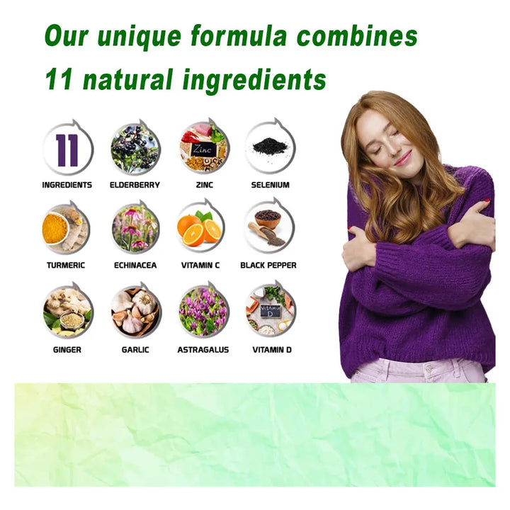 No dejes que las temporadas de frío o el estrés diario afecten tu bienestar. Cada cápsula está cargada con ingredientes premium como vitamina C, D3, zinc y selenio, trabajando juntos para fortalecer tus defensas y proteger tu salud desde adentro. Además, nuestra mezcla patentada incluye saúco negro, ajo inodoro, cúrcuma y equinácea, ingredientes conocidos por sus propiedades antioxidantes y antiinflamatorias.
