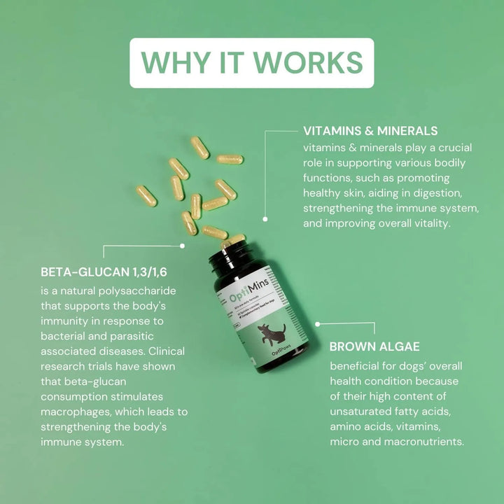 Las cápsulas de vitaminas y minerales actúan directamente en el organismo de tu perro, proporcionando los nutrientes necesarios para fortalecer su sistema inmunológico, mejorar su digestión y mantener su piel y pelaje en óptimas condiciones. Los antioxidantes combaten los radicales libres, mientras que los minerales esenciales apoyan su crecimiento y desarrollo.