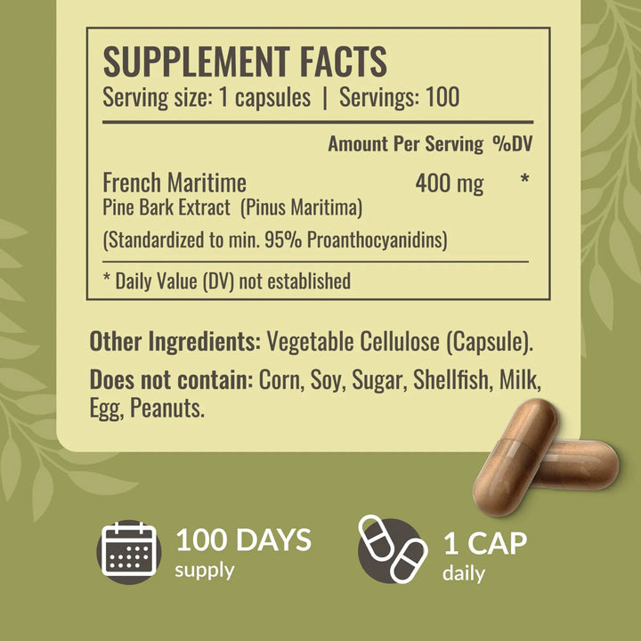 - Fórmula simple y natural 🌿: Solo dos ingredientes: extracto de corteza de pino y cápsula de celulosa vegetal.