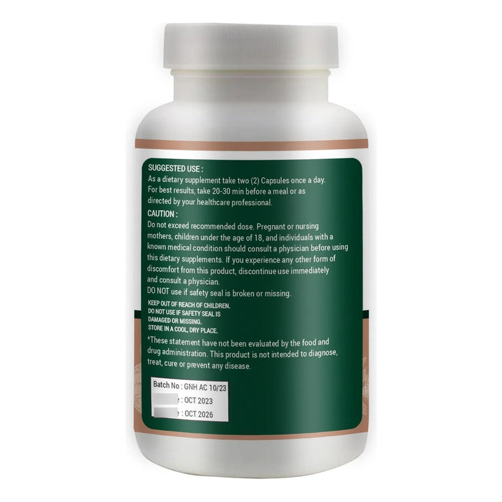 El extracto de fruta Amla actúa como un poderoso antioxidante, combatiendo los radicales libres que aceleran el envejecimiento y debilitan tu sistema inmunológico. Su alta concentración de vitamina C natural ayuda a mejorar la absorción de nutrientes, promueve la producción de colágeno para una piel más joven y apoya la función digestiva. Cada cápsula está diseñada para liberar sus ingredientes activos de manera eficiente en tu tracto gastrointestinal, maximizando sus beneficios.