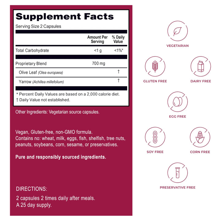 - Ingredientes puros y potentes: 700 mg de hoja de olivo y milenrama por cápsula, sin OMG ni conservantes.