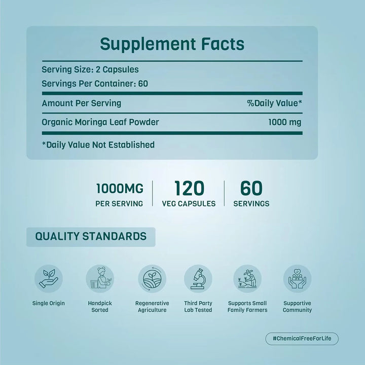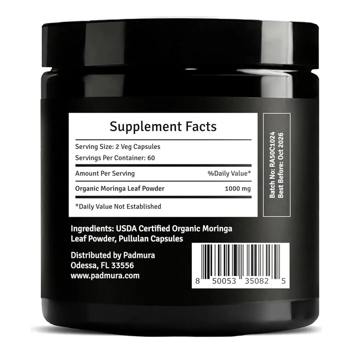 Imagina despertar cada día con más vitalidad, sintiéndote protegido contra los cambios de clima y con una piel radiante. La Moringa Oleifera, conocida como el 'árbol de la vida', es una fuente poderosa de nutrientes esenciales, vitaminas y antioxidantes. Nuestras cápsulas están certificadas por USDA Organic, lo que garantiza que estás consumiendo un producto 100% puro, libre de OMG, gluten y cualquier ingrediente artificial.