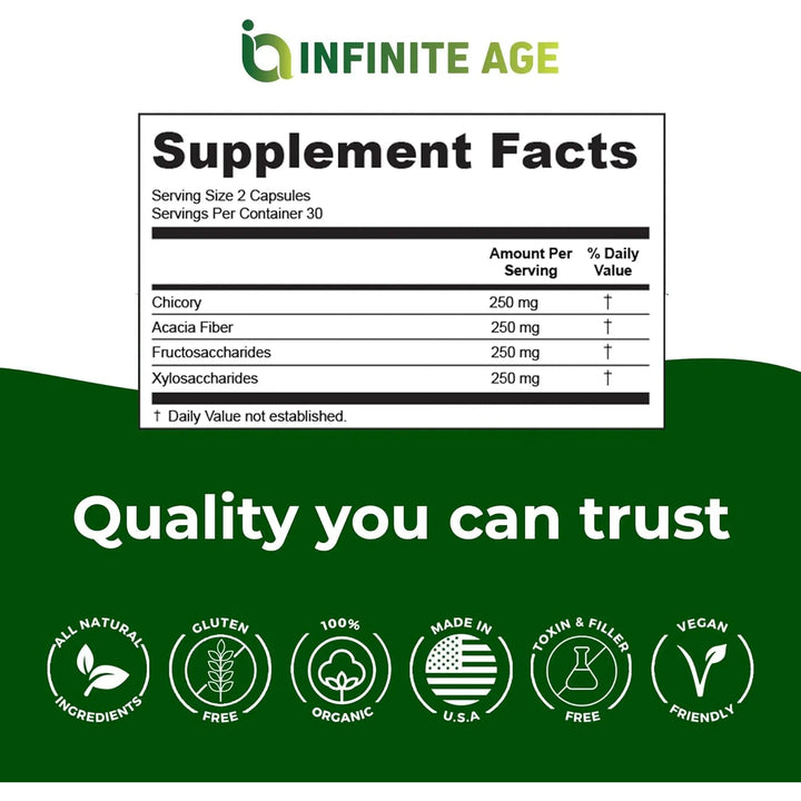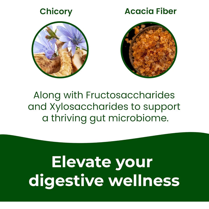 Este producto actúa como alimento para las bacterias beneficiosas de tu intestino, promoviendo un equilibrio saludable en tu microbioma. Los FOS y xilosacáridos estimulan el crecimiento de estas bacterias, mejorando la digestión, reduciendo la inflamación y fortaleciendo tu sistema inmunológico. Además, la fibra de achicoria y acacia ayuda a regular el tránsito intestinal de manera natural.