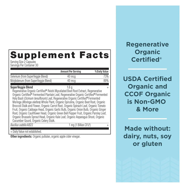 Este poderoso suplemento no es solo otra vitamina más. Está creado con una mezcla exclusiva de 23 superalimentos orgánicos, incluyendo col rizada, brócoli y espinacas, combinados con probióticos clínicamente probados para maximizar la absorción de nutrientes. Cada cápsula es un paso hacia una vida más saludable, respaldada por la certificación Regenerative Organic Certified (ROC), que garantiza los más altos estándares de calidad y sostenibilidad.