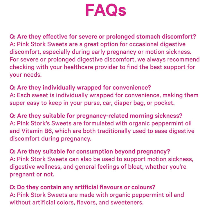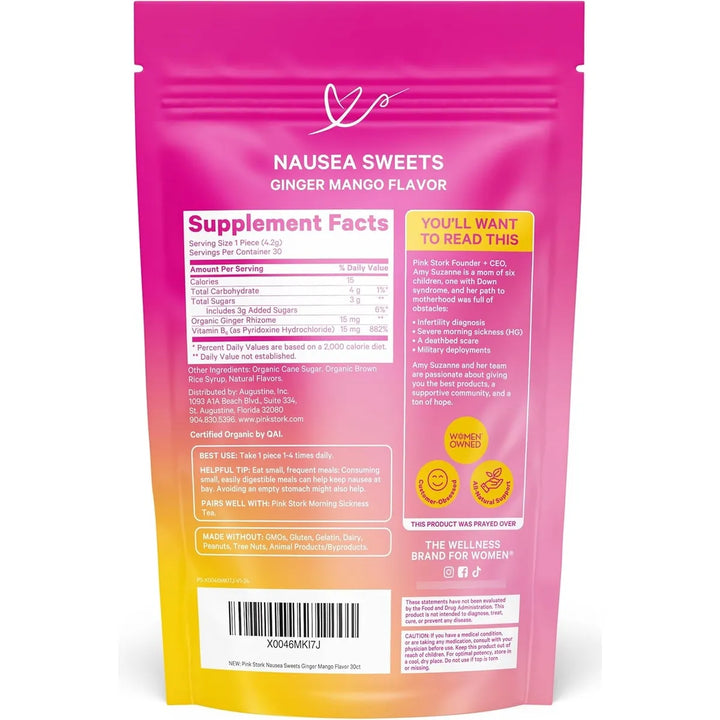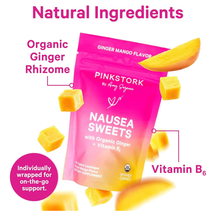 Los caramelos de mango y jengibre de Pink Stork actúan de manera rápida y efectiva gracias a las propiedades naturales del jengibre, conocido por su capacidad para calmar el estómago y reducir las náuseas. La vitamina B6, por su parte, ayuda a metabolizar los alimentos y proporciona energía, combatiendo la fatiga común durante el embarazo. Juntos, estos ingredientes crean una solución poderosa para las molestias digestivas y los mareos.