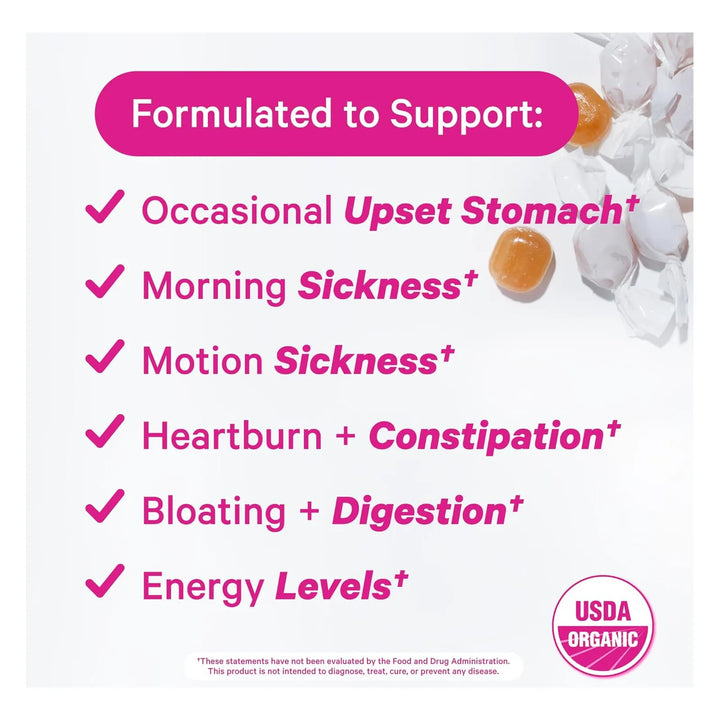 Pero eso no es todo. Estos caramelos no solo alivian las náuseas, también apoyan tu digestión y te brindan energía gracias a la vitamina B6. ¿Sabías que el jengibre es un superalimento reconocido por sus propiedades digestivas? Combinado con la vitamina B6, crea un dúo poderoso que te ayuda a descomponer los alimentos y reducir la acidez estomacal. ¡Es como tener un pequeño equipo de apoyo en cada caramelo!