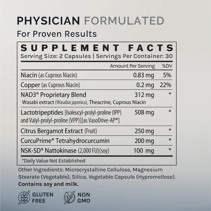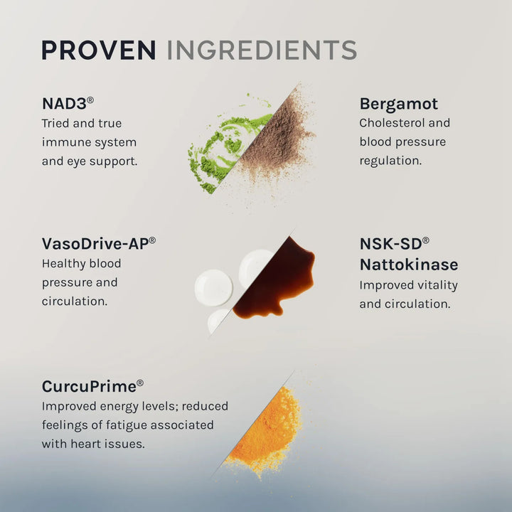 Cardio Prime+ actúa en múltiples niveles para transformar tu salud cardiovascular. La bergamota ayuda a regular la presión arterial, mientras que la nattoquinasa promueve una circulación sanguínea saludable. El complejo NAD3 y la teacrina trabajan juntos para aumentar tus niveles de energía y apoyar el metabolismo celular, brindándote una sensación de vitalidad duradera.