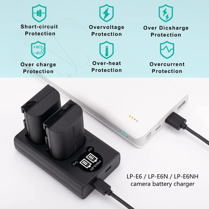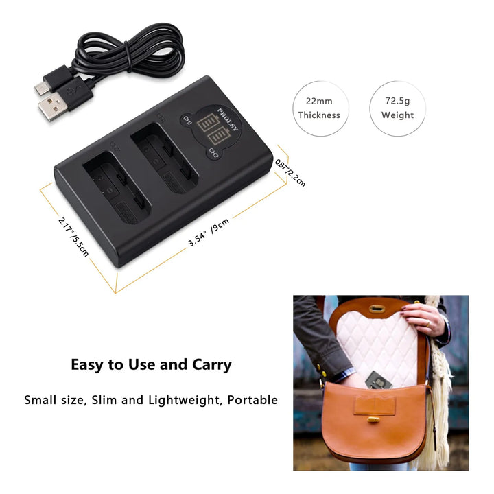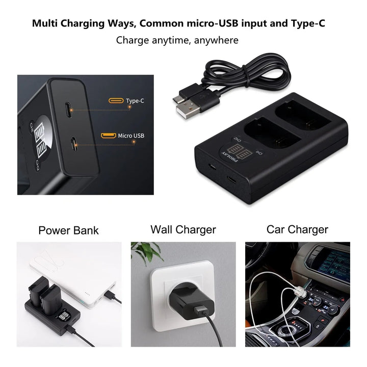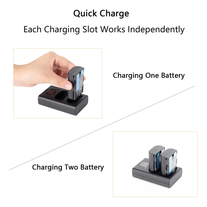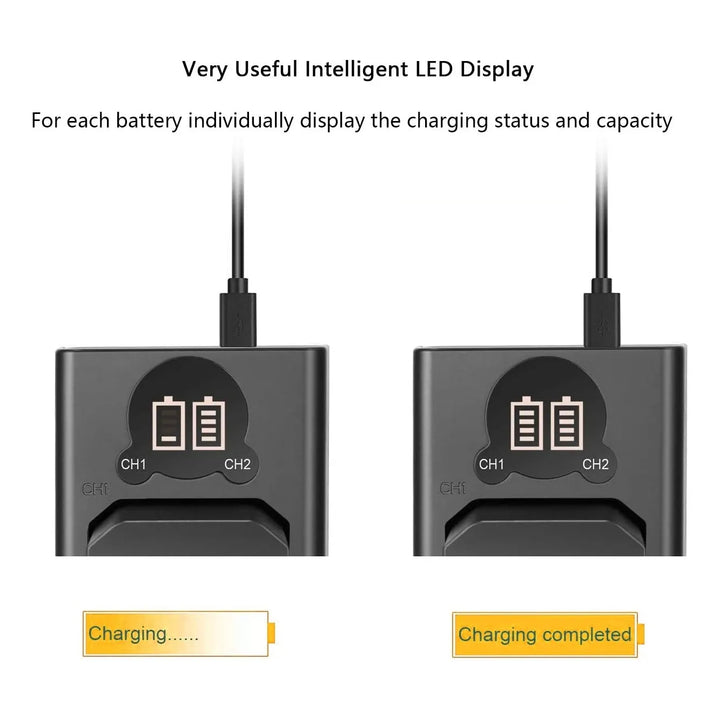 ¿Cansado de cargadores lentos que no muestran cuánto falta para que tu batería esté lista? Nuestro cargador cuenta con una pantalla LED clara que te indica exactamente cuánto ha avanzado la carga, eliminando las adivinanzas. Además, su capacidad para cargar dos baterías simultáneamente significa que siempre tendrás una lista para usar, sin importar cuán intensa sea tu sesión de fotos.