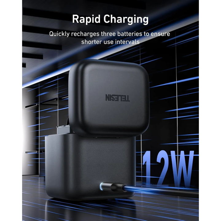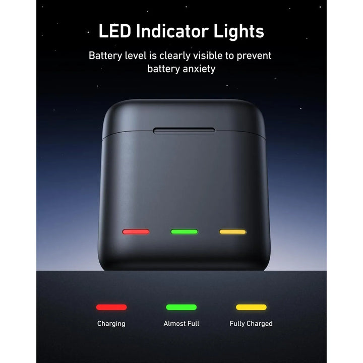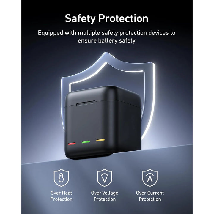 El cargador utiliza tecnología avanzada para distribuir la energía de manera eficiente entre las tres baterías, asegurando una carga óptima sin sobrecalentamiento. Su estuche actúa como barrera contra el polvo y el agua, manteniendo tus baterías en perfecto estado.