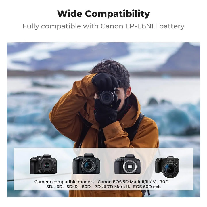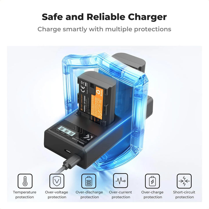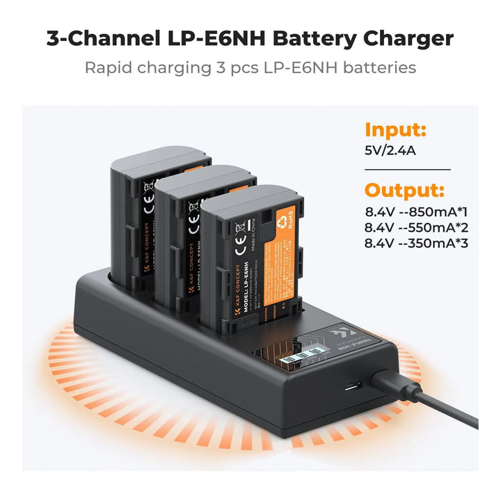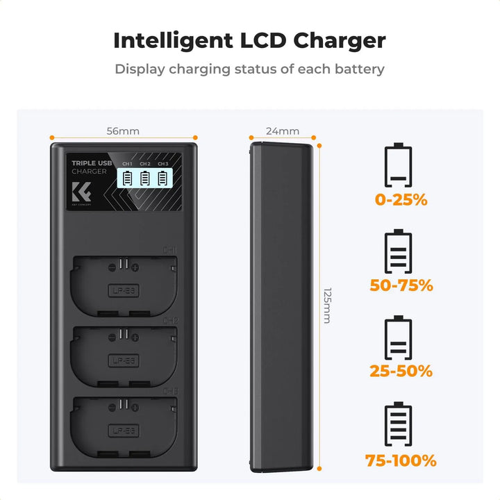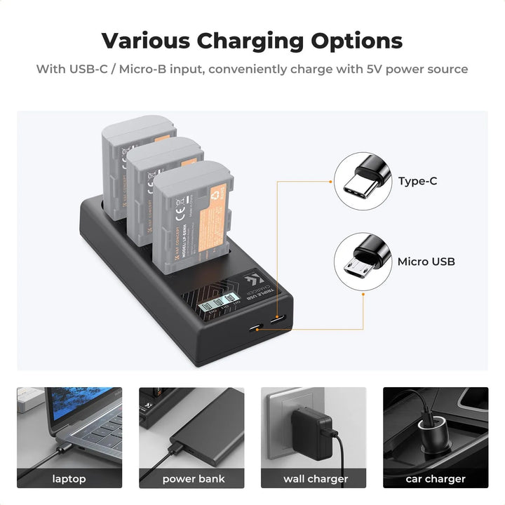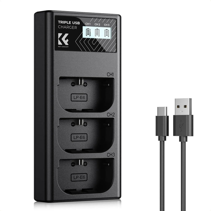 Con su interfaz dual micro-USB y tipo C, podrás cargar hasta tres baterías simultáneamente, ya sea en casa, en el estudio o incluso en movimiento. Olvídate de preocuparte por la compatibilidad; este cargador está diseñado específicamente para baterías Canon LP-E6, LP-E6N y LP-E6NH, asegurando un rendimiento óptimo con tus cámaras EOS R5, R6, R7 y más. La pantalla LCD te mantiene informado en todo momento, mostrando el nivel de carga de cada batería con precisión.