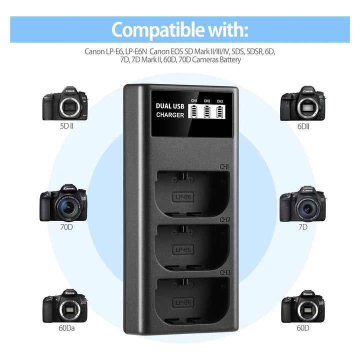 Con compatibilidad para una amplia gama de cámaras Canon EOS, incluyendo modelos como el 5D Mark IV, 6D, 7D Mark II, y más, este cargador está diseñado para adaptarse a tus necesidades. Su pantalla LCD te muestra el estado de carga en tiempo real, eliminando las adivinanzas y asegurando que siempre estés listo para capturar esa toma perfecta.