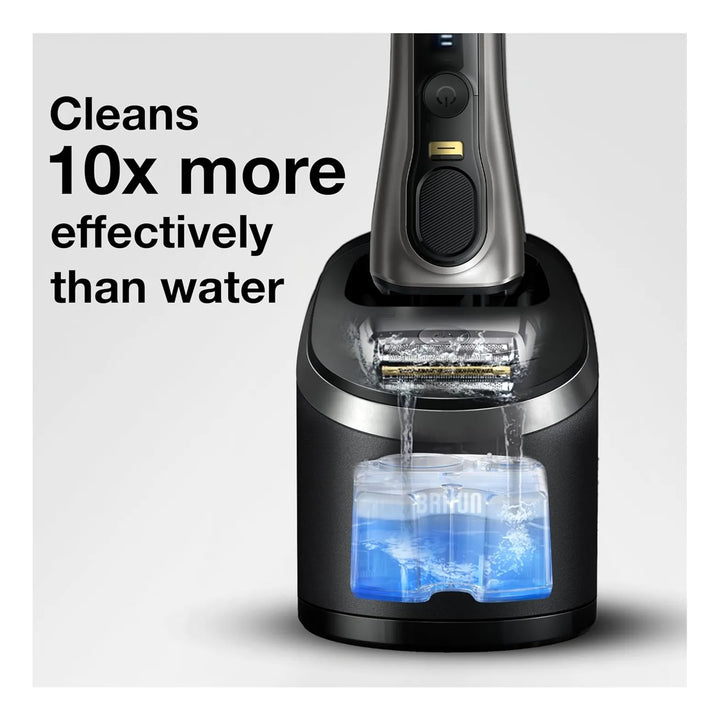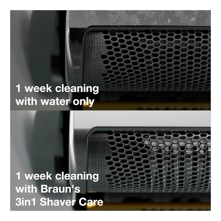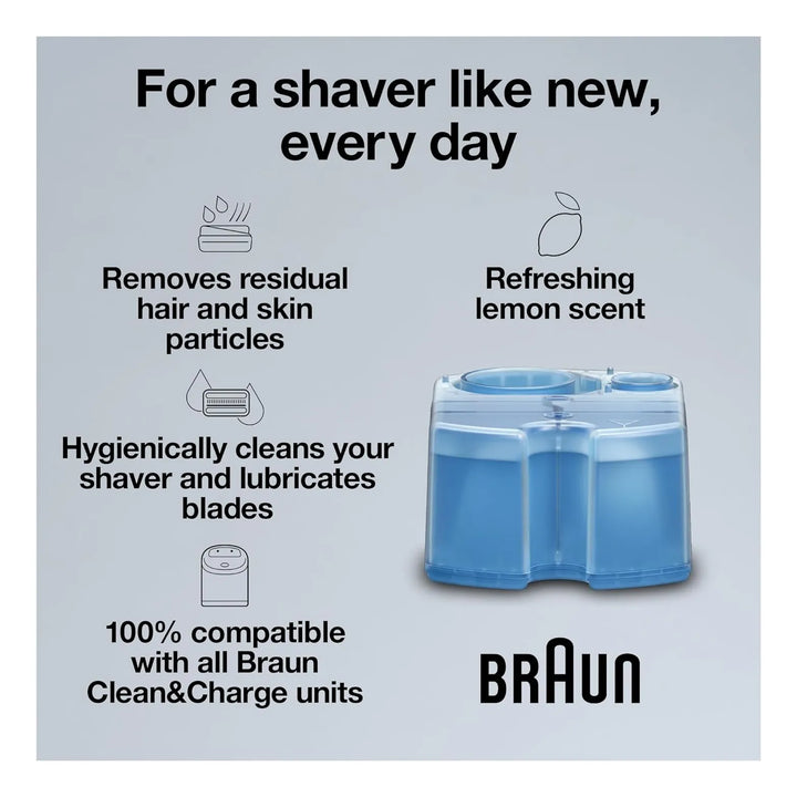 La solución Braun Clean & Renew actúa en tres pasos: limpia, desinfecta y lubrica. Al insertar el cartucho en tu unidad Clean&Charge, el líquido penetra en las cuchillas, eliminando bacterias, restos de vello y células muertas. Los lubricantes de alta energía cubren cada componente metálico, evitando el desgaste y garantizando un deslizamiento suave sobre tu piel.