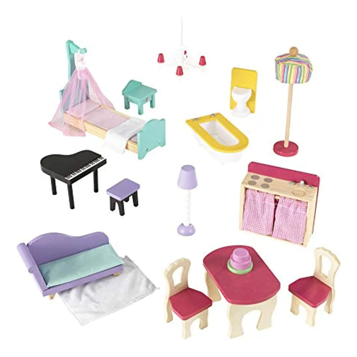 Imagina la emoción en los ojos de tu pequeña cuando descubra la Casa De Muñecas De Madera Kidkraft Annabelle, un mundo de fantasía y creatividad diseñado para inspirar horas de juego inolvidables. Con su impresionante diseño de tres niveles y cuatro habitaciones espaciosas, este juguete no solo es un escenario de juego, sino un lienzo para la imaginación. El ascensor deslizante añade un toque de realismo, permitiendo que las muñecas se muevan con facilidad entre pisos, mientras que los detalles elegantes en madera, como las volutas y el candelabro, crean un ambiente mágico que cautivará a cualquier niño.