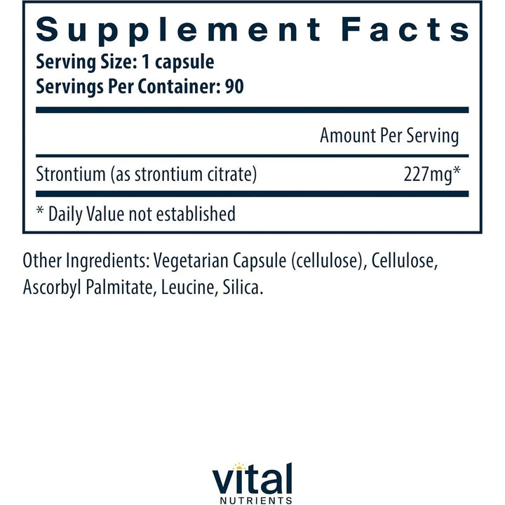 Cada cápsula contiene 227 mg de estroncio, un mineral que trabaja en sinergia con el calcio para promover la densidad ósea y la salud dental. No es solo un suplemento, es una inversión en tu bienestar a largo plazo. ¿Por qué conformarte con menos cuando puedes tener lo mejor?
