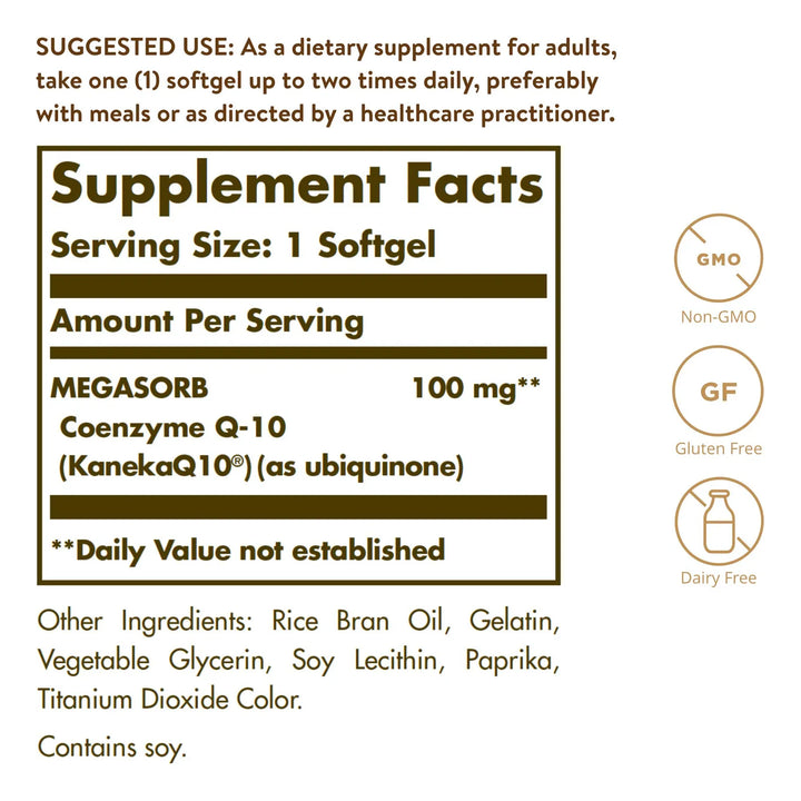 Nuestra fórmula Megasorb CoQ-10 está diseñada para una absorción óptima gracias a su cápsula blanda a base de aceite. Esto significa que cada dosis de 100 mg llega directamente a donde tu cuerpo más lo necesita. Sin gluten, sin lácteos y sin ingredientes artificiales, es la opción pura y confiable que tu cuerpo merece. ¿Por qué conformarte con menos cuando puedes tener el estándar de oro en suplementos nutricionales?