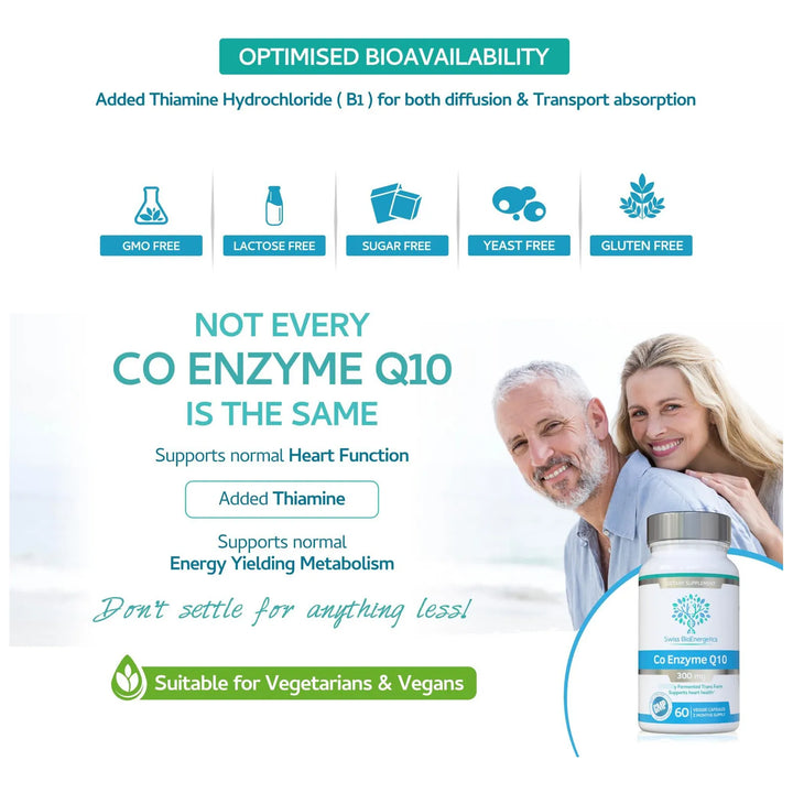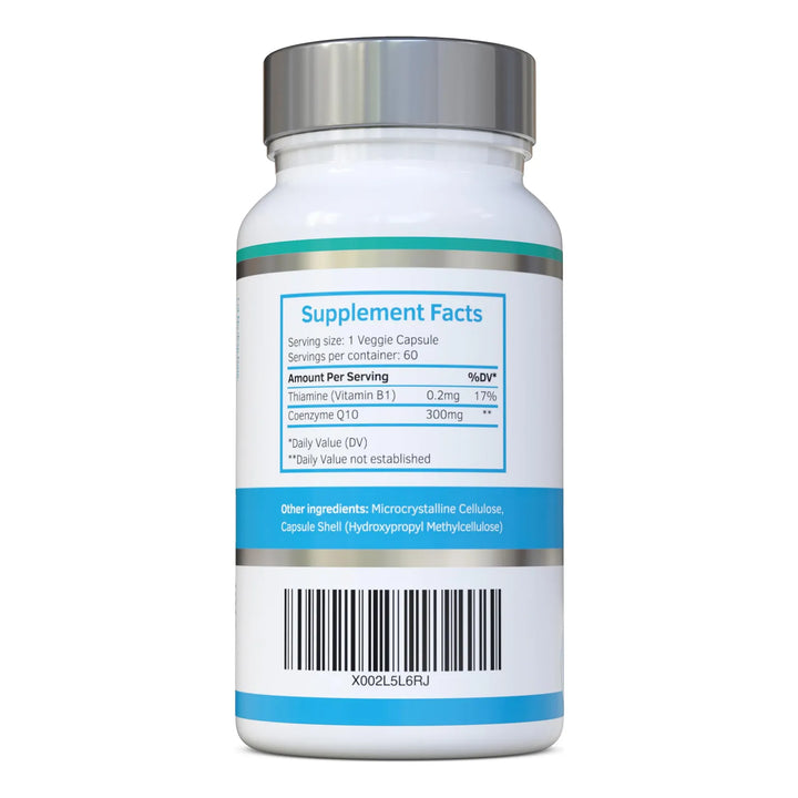 La Coenzima Q10 es un nutriente esencial que actúa como antioxidante y participa en la producción de energía celular. Con la edad, los niveles de CoQ10 disminuyen, afectando tu vitalidad. Nuestra fórmula de 300mg en cápsulas repone estos niveles, apoyando la salud cardiovascular, cerebral y el sistema inmunológico. La adición de tiamina (vitamina B1) optimiza el metabolismo energético, brindándote una sensación de bienestar duradero.