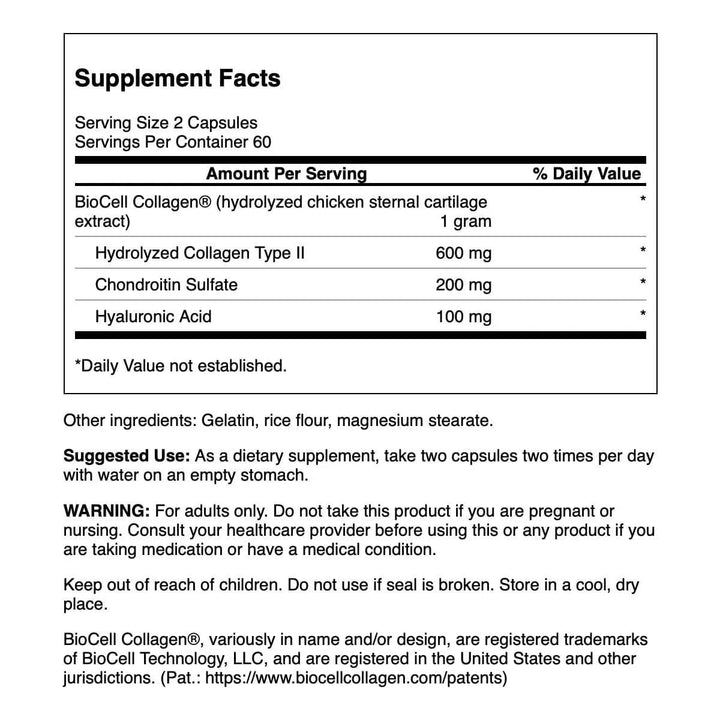 - Contiene 500 mg de colágeno tipo II por cápsula, la dosis óptima para resultados efectivos 😊