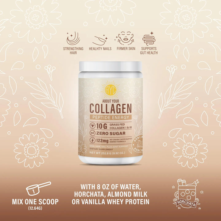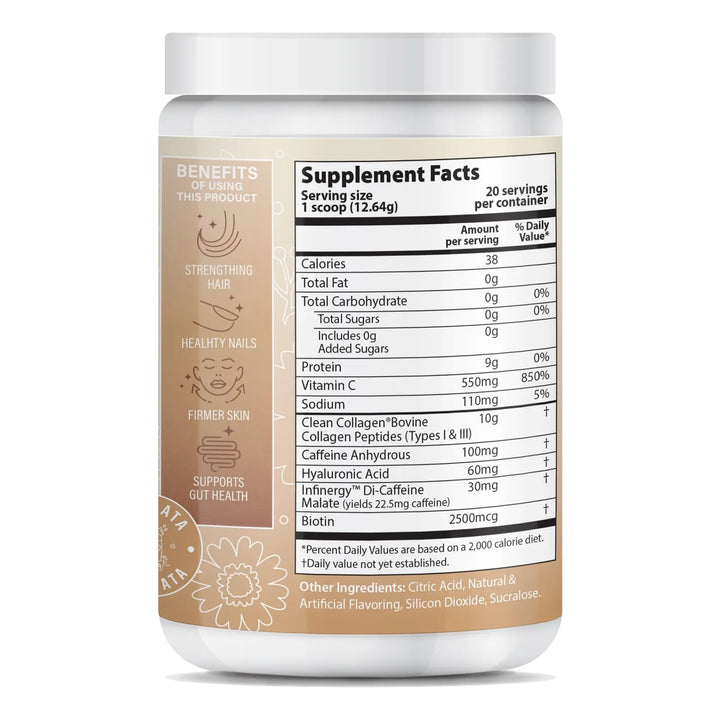 Imagina despertar cada mañana con una piel más tersa, uñas que no se quiebran y una melena que brilla con salud. Nuestro Colágeno en Polvo Peptide Energy no solo revitaliza tu belleza, sino que también infunde tu día con energía sostenida gracias a su combinación única de cafeína y vitamina C. Es como un café matutino, pero con superpoderes para tu piel.