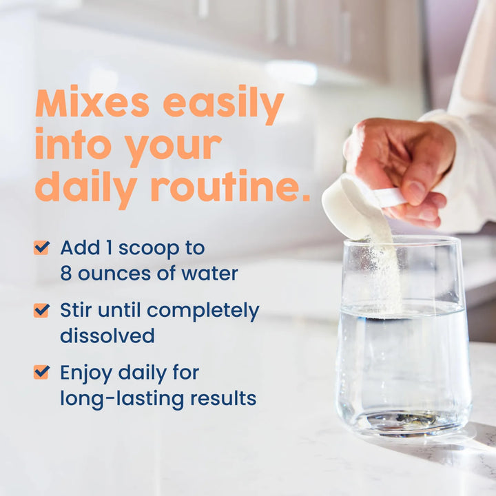 - Mezcla una cucharada de péptidos de colágeno en 8 onzas de agua fría o caliente.