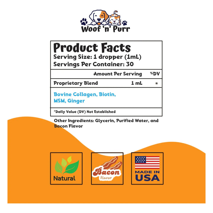 ¿Has notado que tu perro ya no tiene la misma energía de antes? ¿Su pelaje luce opaco o su piel parece irritada? No te preocupes, nuestro Colágeno Líquido para Perros está diseñado para devolverle la vitalidad y brillo que tanto merece. Con una fórmula avanzada que combina colágeno bovino, MSM y biotina, este suplemento no solo mejora la salud de su piel y pelaje, sino que también fortalece sus articulaciones y apoya su digestión. Imagina ver a tu compañero feliz, activo y lleno de vida nuevamente. ¡Eso es exactamente lo que lograrás con cada gota!